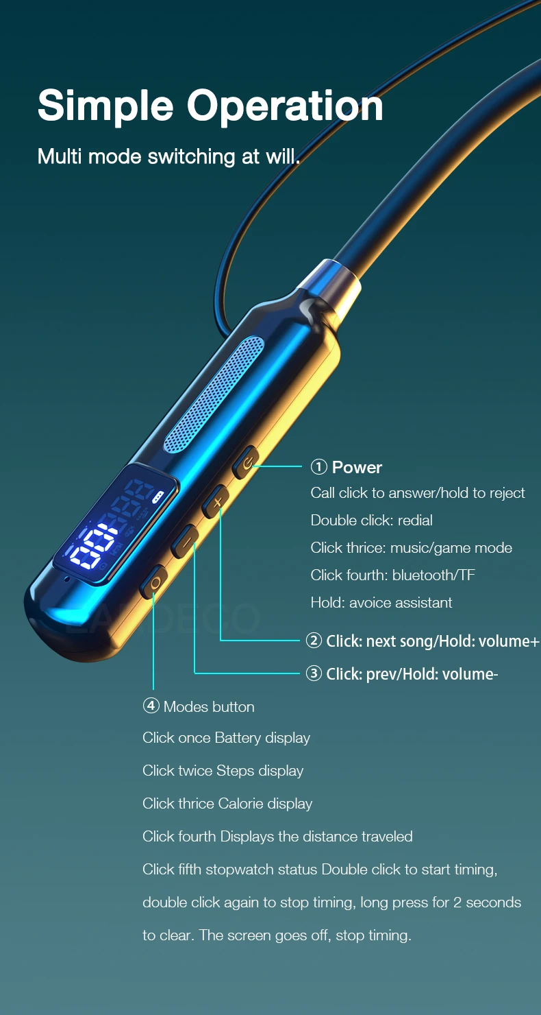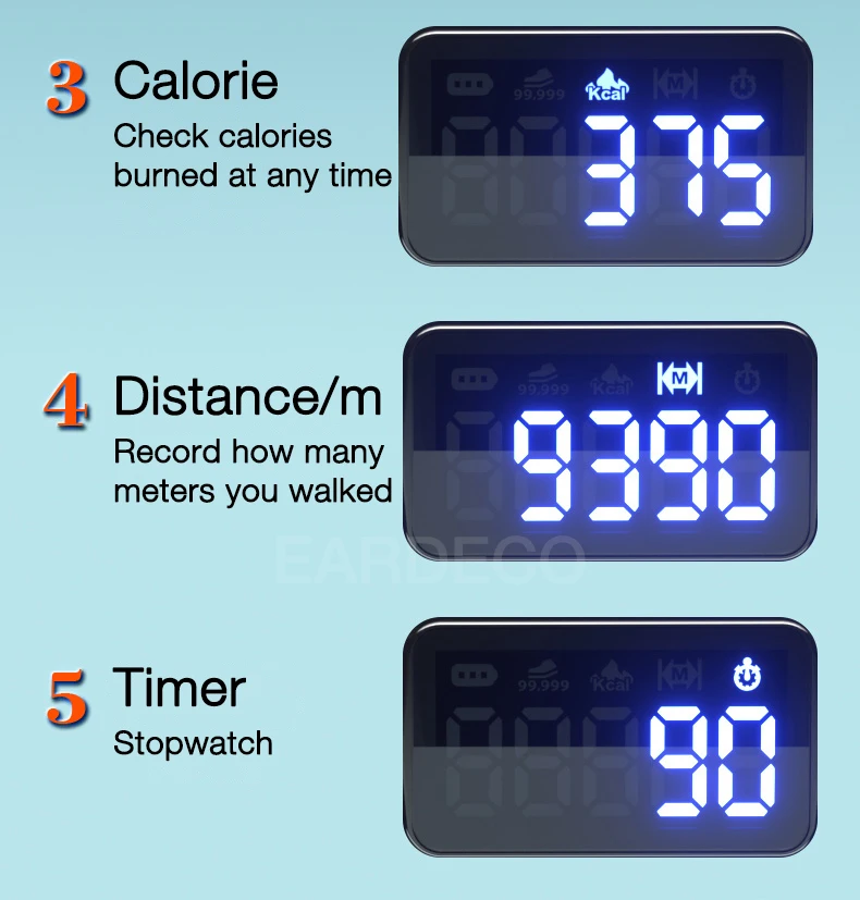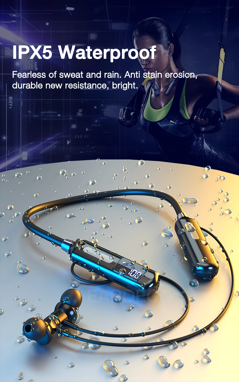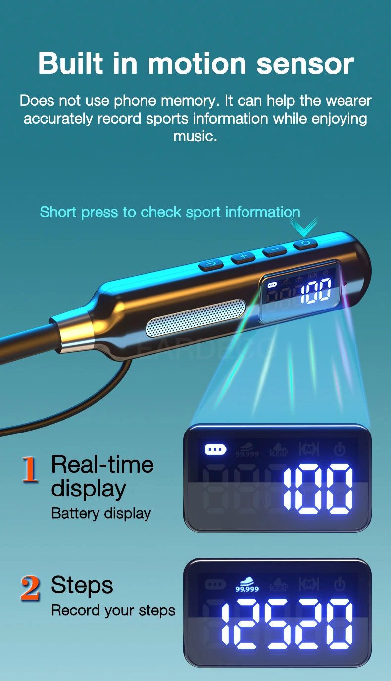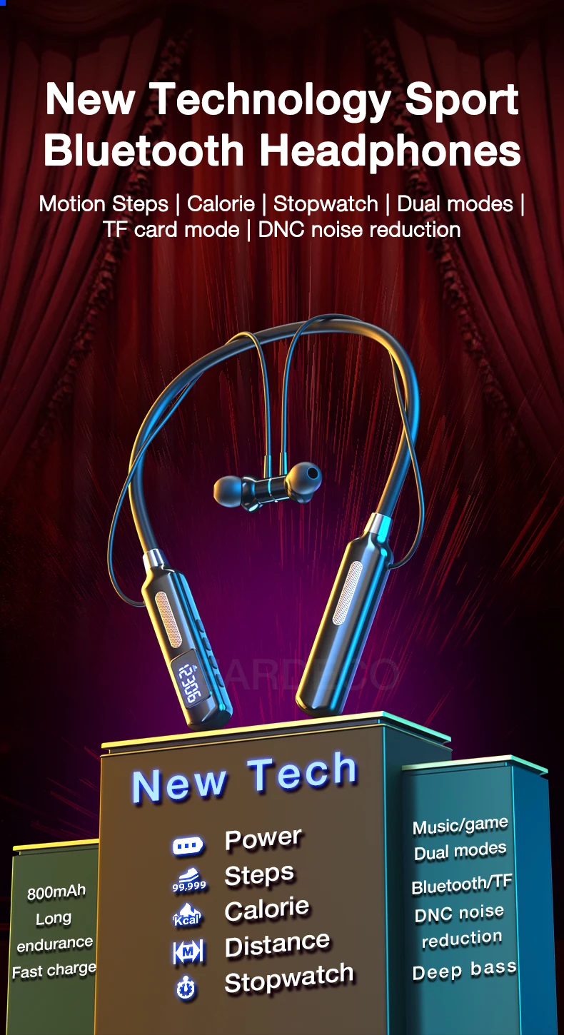 Track your fitness while enjoying music with the EARDECO Bluetooth Sports Earphones. Featuring a built-in sports chip for steps, calories, distance, and stopwatch, plus Active Noise Cancelling, waterproof design, and HiFi stereo sound. Comfortable, wireless, and perfect for workouts or daily use.