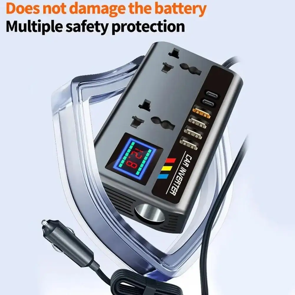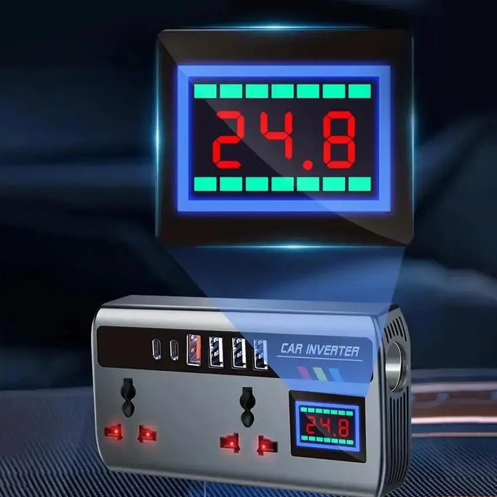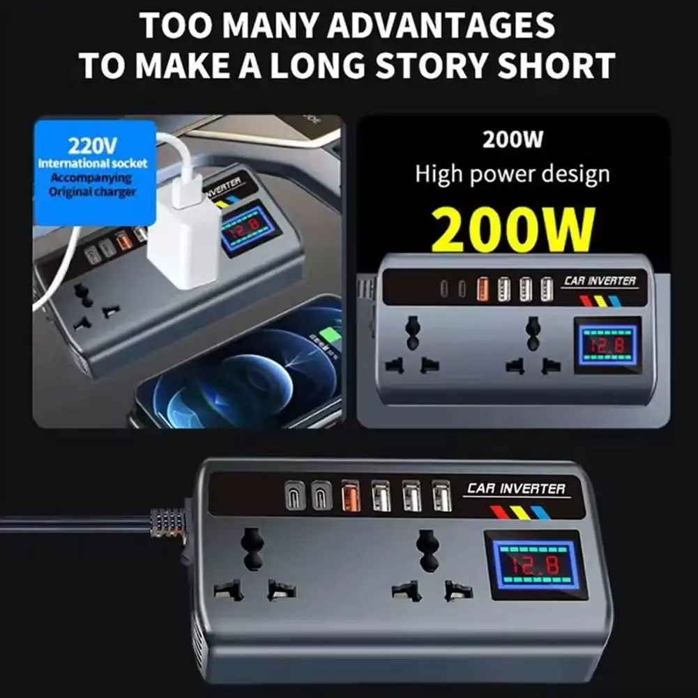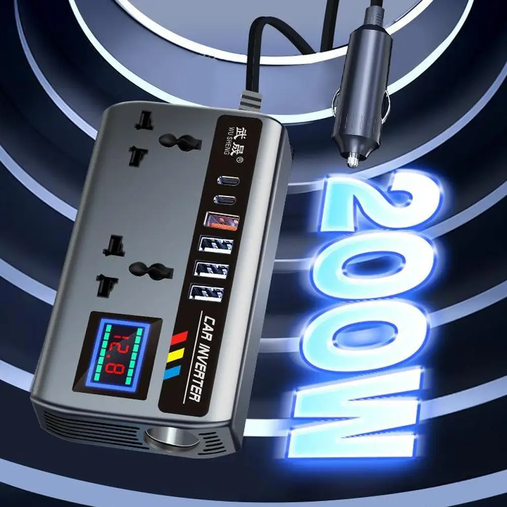 Power your devices on the go with this 200W Portable Car Inverter Converter. Designed for universal 12V/24V vehicles, it converts car power to 220V and features multiple fast-charging ports, AI smart protection, dual AC outlets, and a compact design ideal for travel and daily use.
