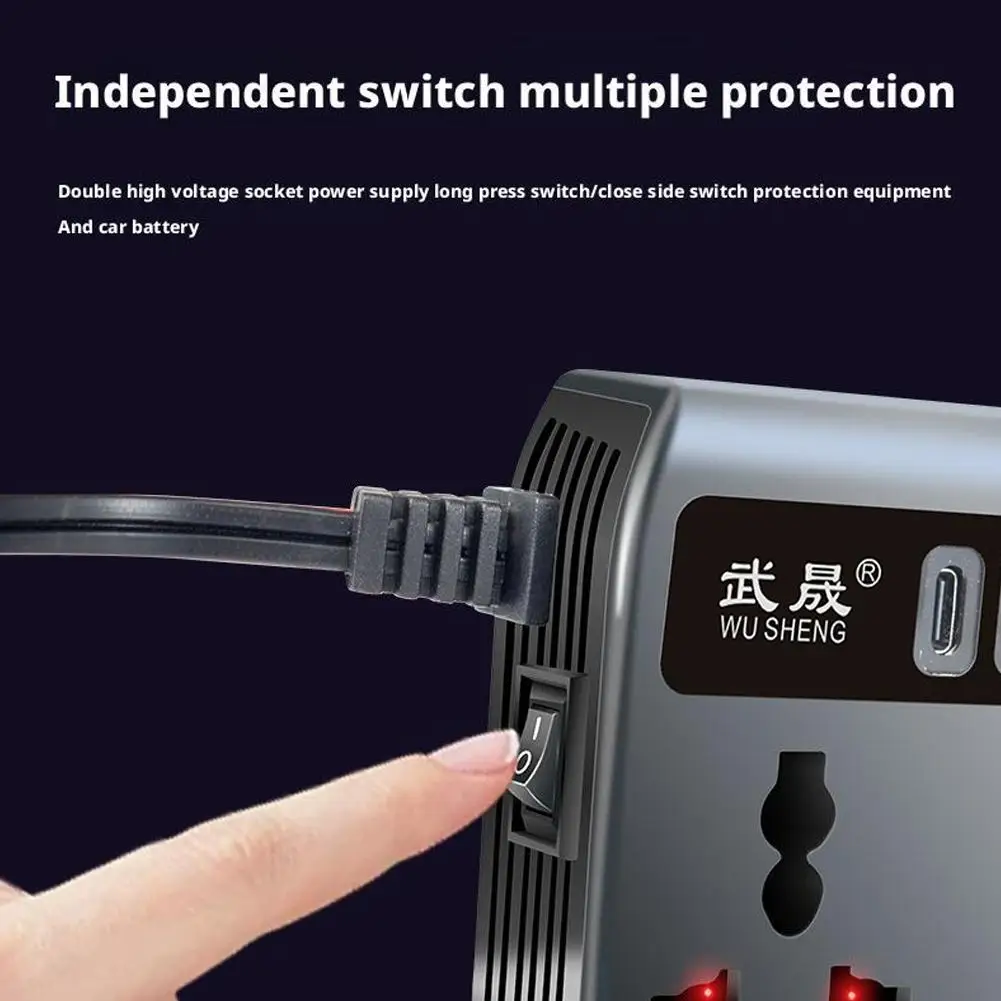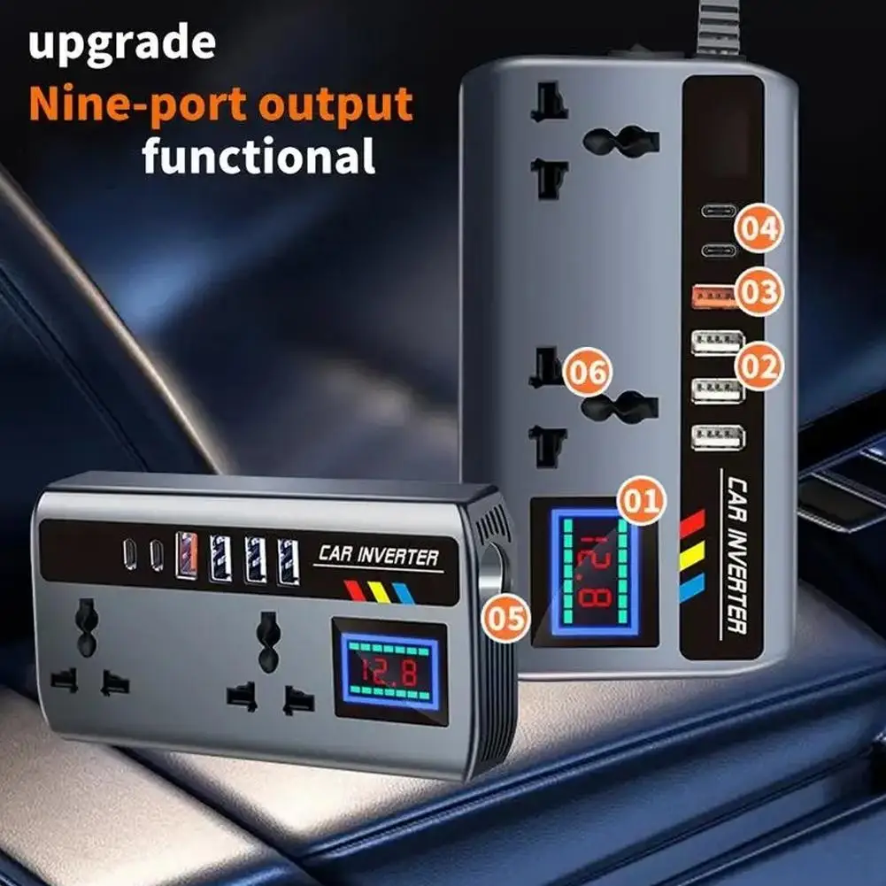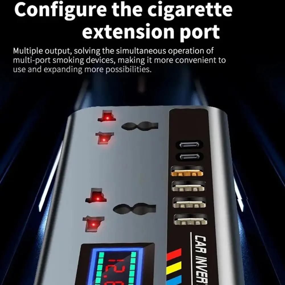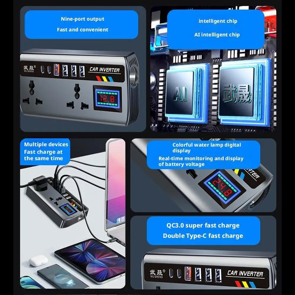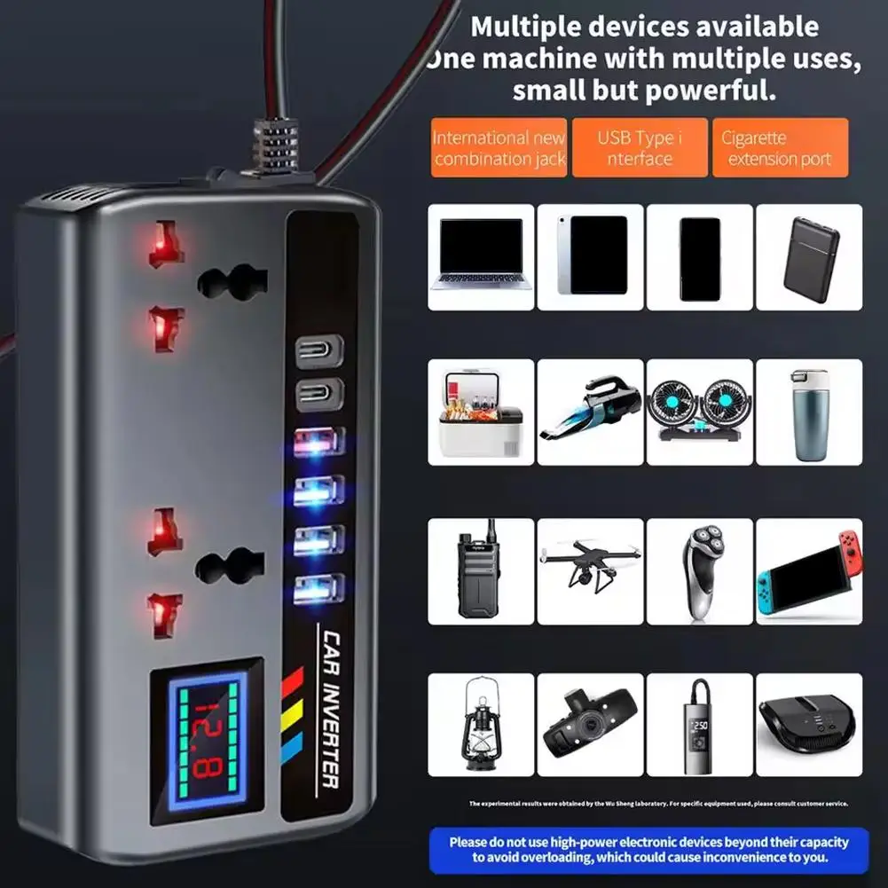 Power your devices on the go with this 200W Portable Car Inverter Converter. Designed for universal 12V/24V vehicles, it converts car power to 220V and features multiple fast-charging ports, AI smart protection, dual AC outlets, and a compact design ideal for travel and daily use.