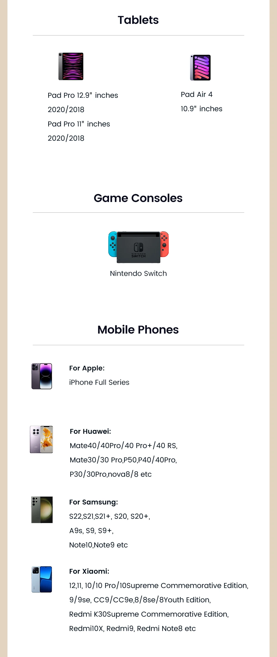 - Compatible with iPhone 15 series, Samsung S23-S9, Xiaomi, Huawei, Honor, and more.