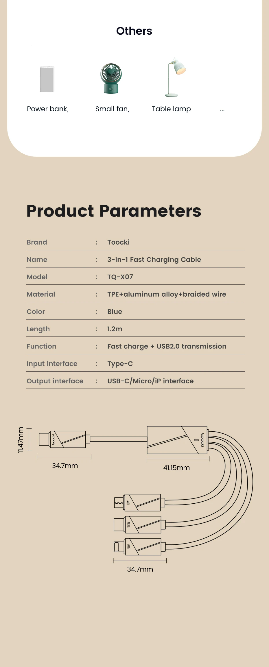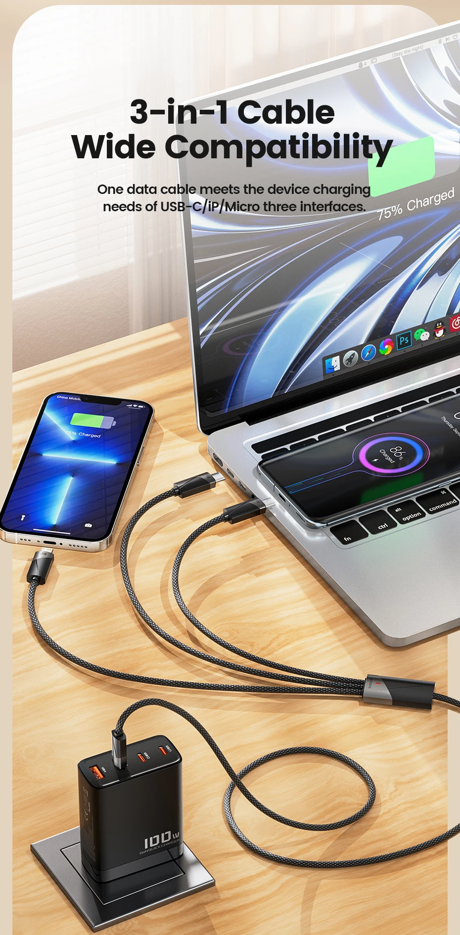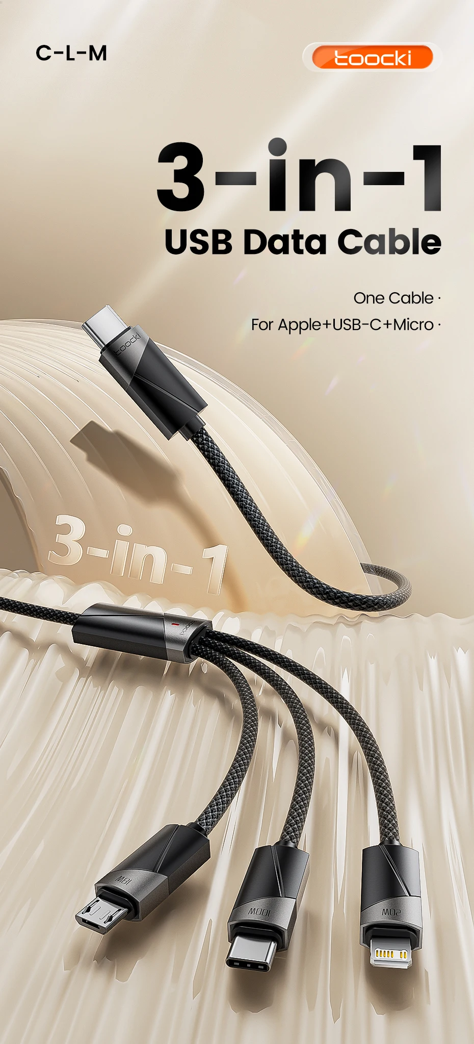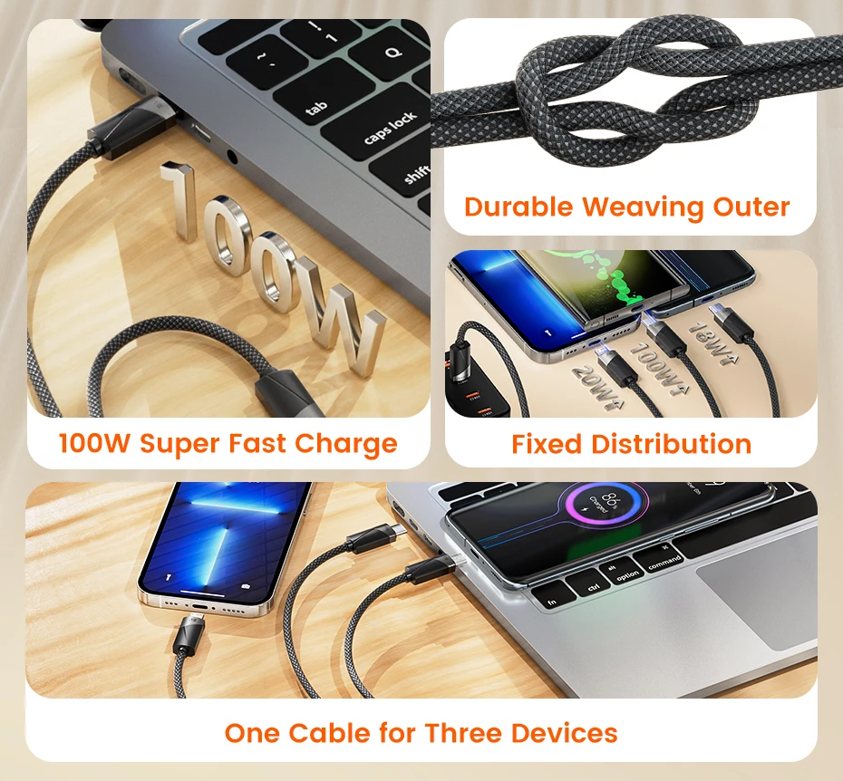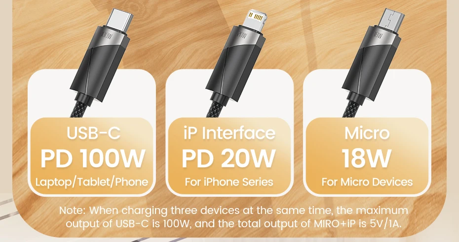 3-in-1 connectors: Type-C, Lightning, Micro USB for all devices