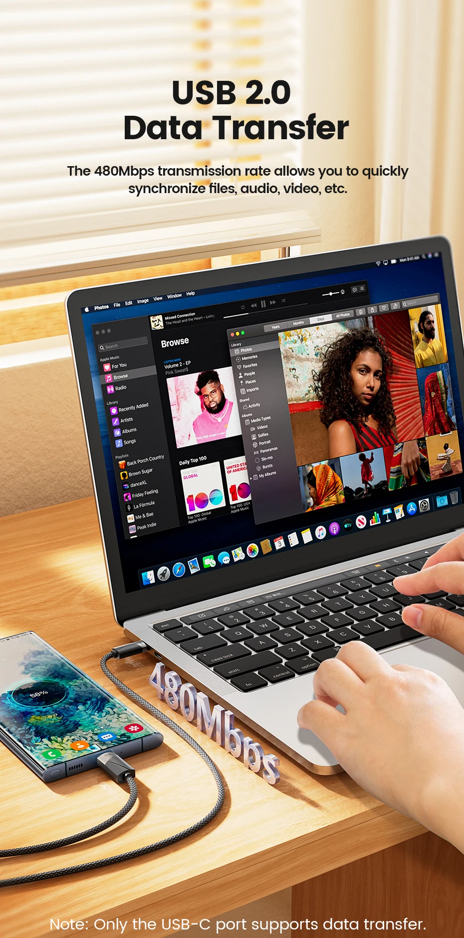 - High-speed data transfer for phones, tablets, and Macbooks